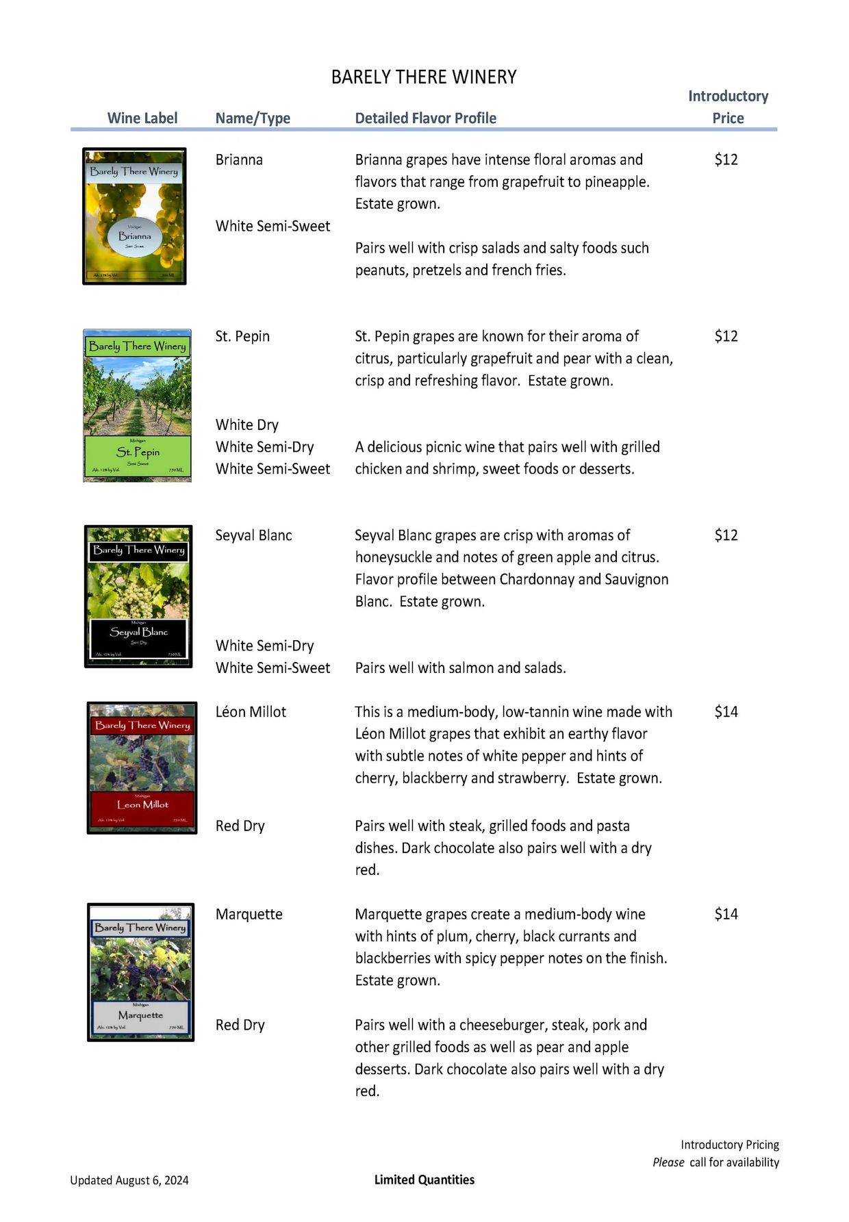 Barely There Winery is a boutique winery specializing in estate wines. We grow, harvest, process and bottle on-site to produce an assortment of quality wines. Our Tasting Room will be open select weekends (Fridays and Saturdays 11-6) to give you more time to enjoy our great wines as we close out our first year. Halloween weekend (October 31 and November 1)